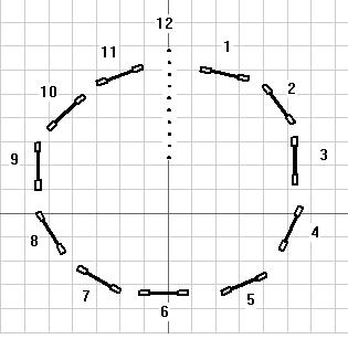Så vad hade slalom med klockslag att göra? När vi beskriver från vilket riktning hunden kommer in i slalom så anger vi det med hjälp av klockan. Tänk er att själva slalom är stora visaren som står på klockan 12; sätter vi sedan hinder där de olika klockslagen på klockan finns ser vi att beroende på vilket hinder hunden tar så kommer den att gå in i slalom vid olika siffror (se skiss).