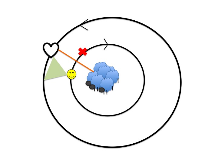 Det var så att Jo Agnar ville att vi skulle köra en övning för att lösgöra hundarna i cirkelarbetet genom att låta hunden röra sig åt ena hållet och föraren åt det andra hållet. Genom att gå mot varandra så skulle vi möta konfliktpunkten flera gånger. Samtidigt möter man också upp balanspunkten vi flera tillfällen, vilket är belönande för hunden. Konfliktpunkten är då hunden och föraren möts och skall gå om varandra. Vi denna situation vill hunden helst vända och byta cirkelriktning för att hamna i balans till föraren, men vi vill alltså i det här fallet att hunden fortsätter förbi oss. Anm. balans är då hunden är på andra sidan fåren, hunden vill gärna hålla fåren mellan sig själv och föraren=kontroll.