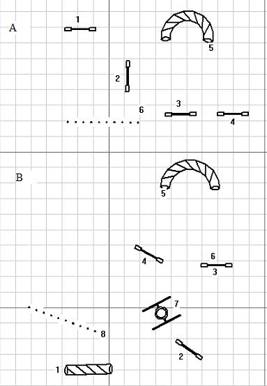 A – här ville vi testa hur hundarna reagerade på många hinder kring slalom. Det stod även ett långhopp och en tunnel strax bakom slalom. Att träna med hinder omkring slalom är också en störning, speciellt om det är ett favorithinder som står i närenheten och drar.