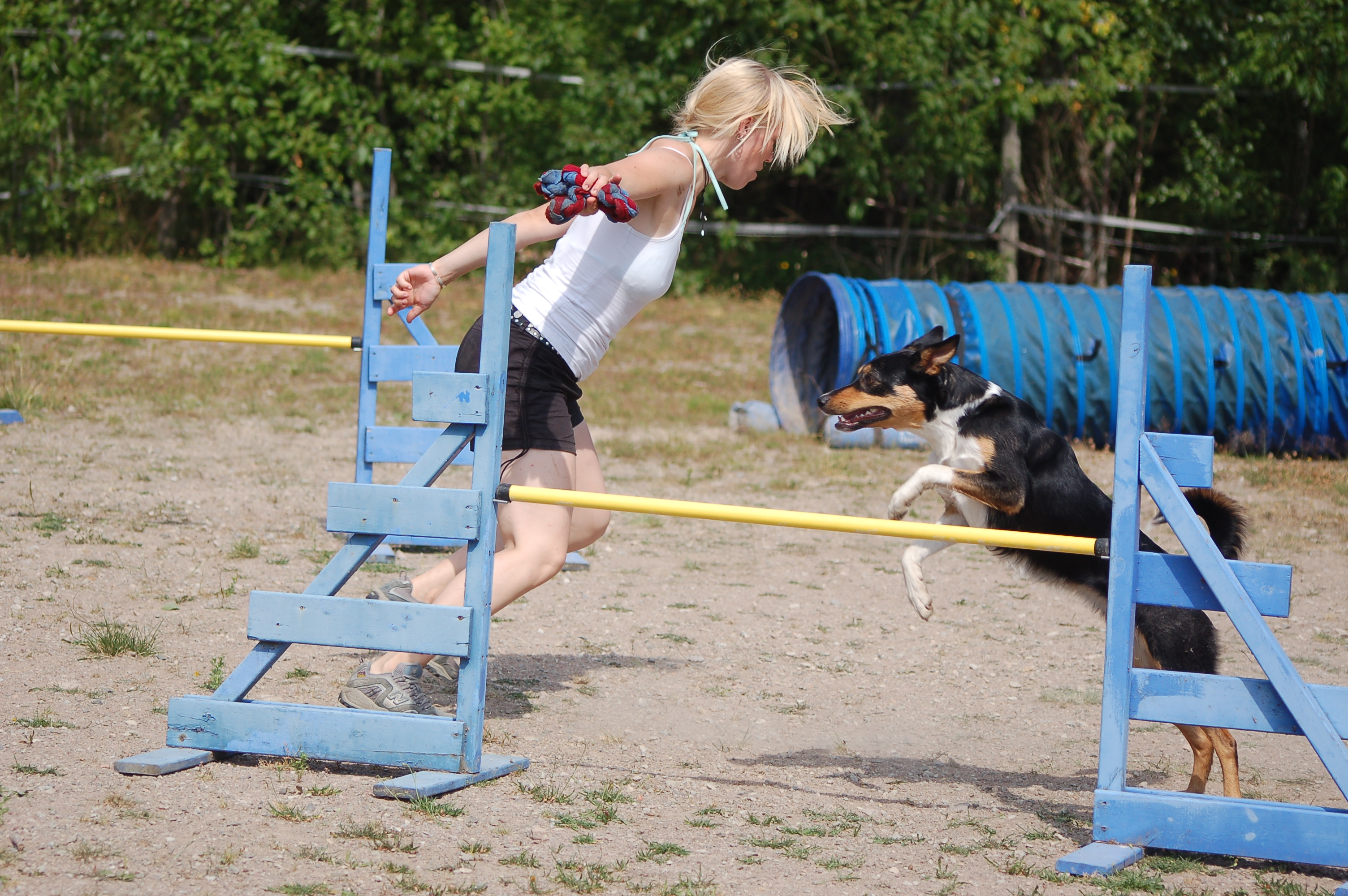 Kursen för Lisa Frick var bra. Jag kan inte säga att det var något revolutionerande, men en del som jag inte tidigare använt mig av – bara sett andra utföra. Tror det kan fungera (såg det fungera!) riktigt bra på vissa hundar, sedan kan jag tycka att det blir lite väl mycket förberedelse för andra. En smallis kan faktiskt hopp runt ett hinderstöd. 🙂 Får fundera igenom lite och redigera lite film så kommer rapport även därifrån. Smolket var att Ozz fick en överansträngning efter första passet och haltade. Gruset gjorde säkert sitt till. Stod där utan hund.