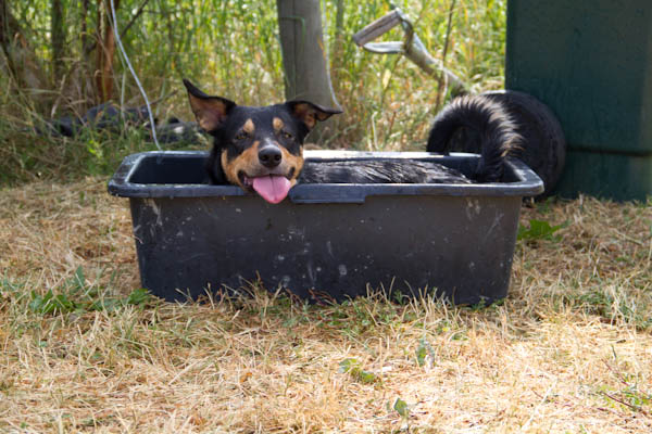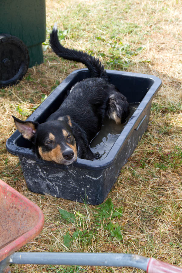 Ett måste en varm dag 🙂 Att Ozz sedan planterar sig i den och inte låter någon annan komma i är en annan femma 😉 Lycklig är den hund med en egen badbalja! Ibland är det tur att man är modell mindre.
