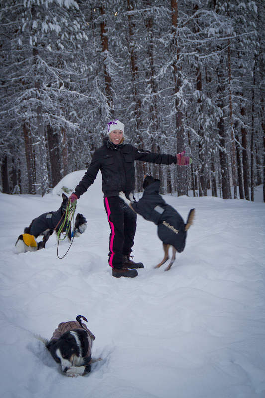 haha, Tess ser inte lika glad ut på bilden när hon försöker bita bort snökokorna under tassen:)