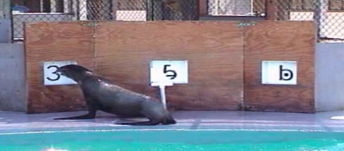 Colleen Reichmund som jag nämnt flera gånger i min blogg jobbar med Rio som hon har lärt att olika symboler hör ihop, lite som memory fast lite mer invecklat då det kräver att Rio lär sig att vissa symboler hör ihop och andra inte. Jag har flera filmer som jag tyvärr inte kan visa på bloggen, men de visar Rio som hoppar upp ur vattnet, ställer sig framför en vägg med tre luckor. Mittenluckan öppnas och visar ett F under ett par sekunder, vartefter luckan stängs. Så snart den är stängd öppnas så de andra två luckorna, på vardera sida om Rio och visar ett A och en 3:a. Rio tittar fortfarande på mittenluckan och man ser hur hela sälen skakar av förväntan och du kan riktigt höra henne tänka: ”jag kan jag kan jag kan”, så lyder en signal. *PIIP*. Rio kastar sig mot A och markerar den med nosen! BINGO. *pling* och fisk! Yey! (Extra, utanför denna diskussion: om hon efter en serie av bokstäver hoppar upp och mittenluckan visar ett # betyder det att han skall byta system till just nummer… Hon är verkligen superduktig!)