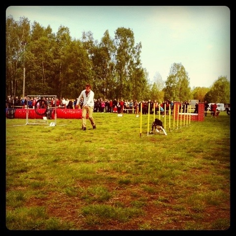 Dagen till ära fick Fredrik låna Pi(?) en väldigt duktig border collie tik, som skötte honom galant 😉 att köra hopp 2an med. Såg vid ett par tillfällen nästan bra ut. Ska bli kul att se vad det blir av inslaget på tv. Flera agilityprofiler blev intervjuade så det kommer bli roligt att kika på!