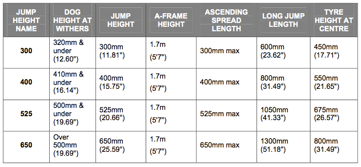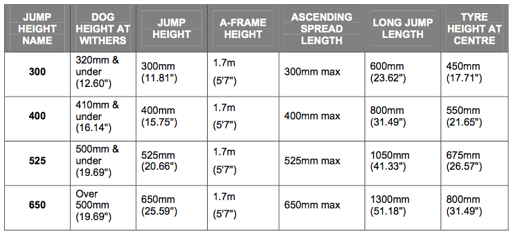 Lägsta gruppen hundar ska vara 32 cm och under, andra 41 cm och under, tredje 50 cm och under och högsta gruppen är hundar över 50 cm i mankhöjd. Du har skrivit samma mankhöjd som maxhinderhöjd.