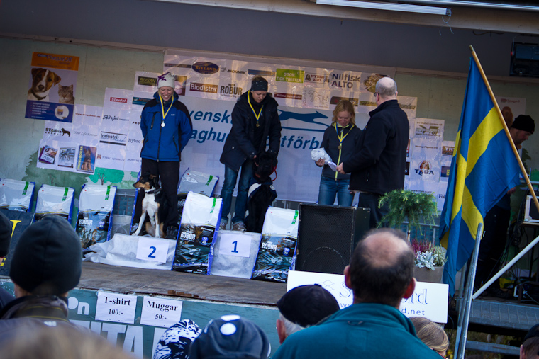 Slutligen var det dags för prisutdelning, hurrarop och ta i hand. På vår pall fann vi en schnauzer, en djungelkatt och en tax! Snacka om salig blandning av hundraser – härligt! Med oss hem fick vi en silvermedalj som snart hänger i Tumlaren, en säck Robur hundfoder (någon som vill köpa?) och SM diplom med tillhörande SM plakett. Minnen för livet.
