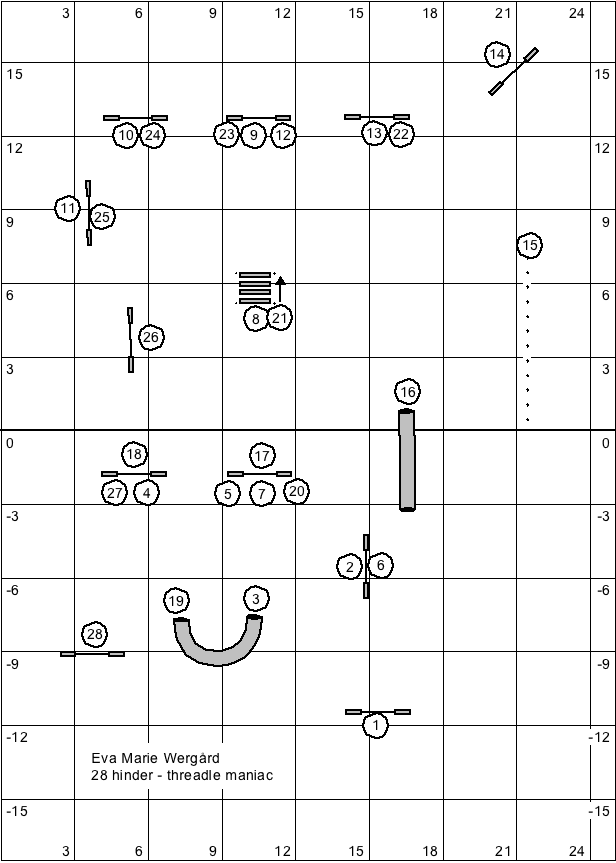 Kortfattat: en threadle är när två hinder efter varandra skall tas från samma håll, se ovan t ex 4 och 5. För att få in hunden emellan skickar jag hunden över hinder 4 med vänster arm, för att få in den emellan, använder jag mig av höger arm – samtidigt som jag vrider kroppen för ett ögonblick, på det sättet visar jag hunden att jag vill att den kommer in emellan, när den gått in emellan byter jag tillbaka till vänster arm och skickar den på hinder 5 m vänster arm 🙂