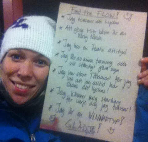 Affirmationen kan gälla allt från attityd till nervositet, ett specifikt moment eller helt enkelt känslan inför något specifikt. Tänk på att börja meningarna med ”jag känner/tycker/vill…” etc, det är DU som säger pratar till dig själv. Tänk också på att vända meningarna till något positivt, skriv därför: ”Jag älskar slalom” istället för ”jag skall inte hata slalom” 😉 Håll dig till ett mindre antal meningar fokusera på att förändra/förbättra en specifik sak. Har du en lång lista, som den på bilden, kan det bli svårare att genomföra. gör det enkelt i början!