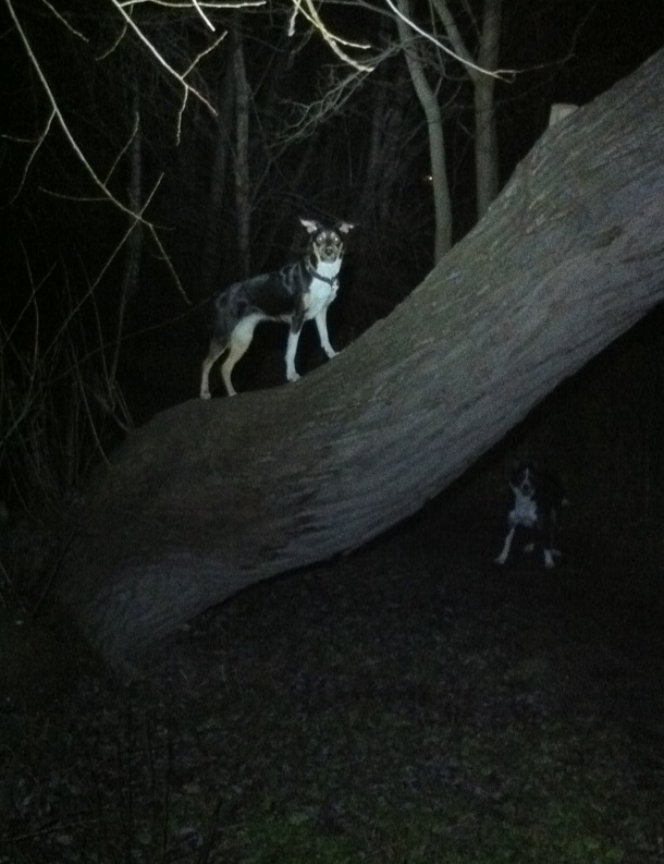 En sväng förbi det hängande trädet vid Bergianska med vallhundarna blev det för Simon ikväll. Själv har jag faktiskt varit på en yttepyttepromenad i skalmantempo idag – nästan 1 km tror jag att det blev (glömde runkeepern). Wohoo!!