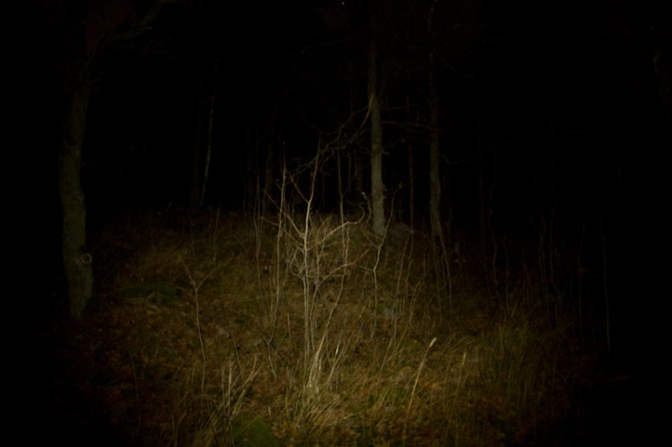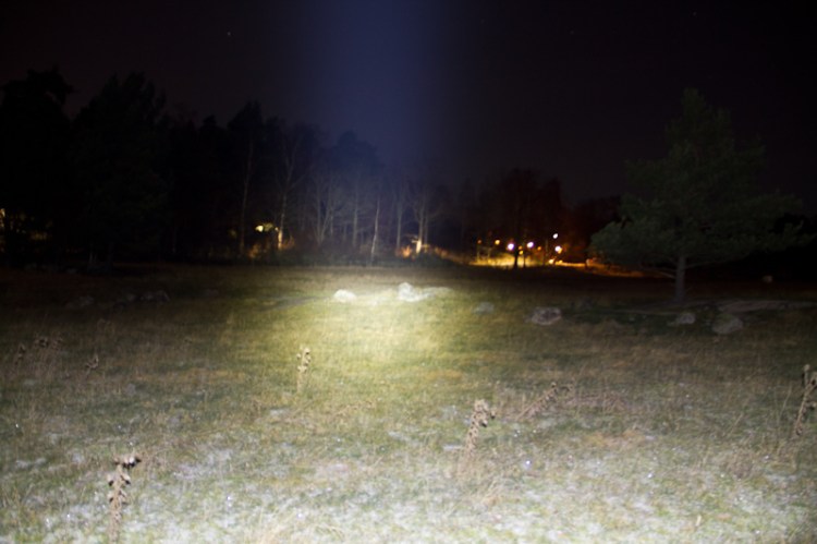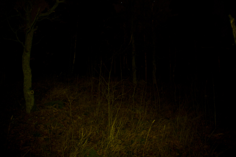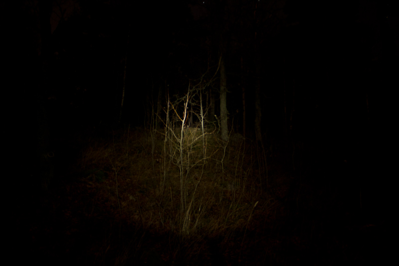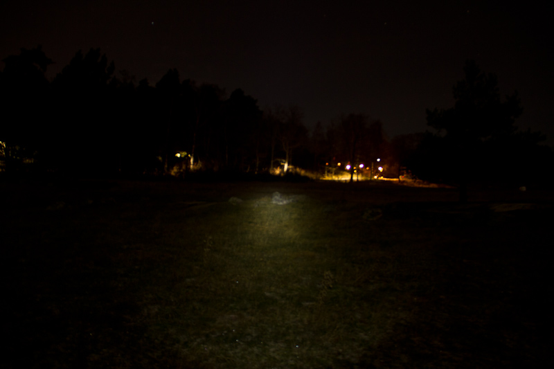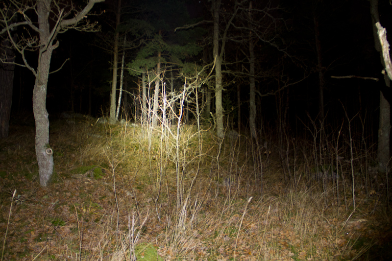 Anna frågade om pannlampor på facebook idag, och eftersom vi precis köpt var sin Magicshine MJ-808 som vi är väldigt nöjda med kommer här på begäran lite testbilder. Egentligen hade jag helst velat ha med en vanlig billig pannlampa från Jula eller något som jämförelse, men den hade gått och gömt sig och vägrade låta sig bli upphittad till skogspromenaden ikväll. Så den gamla trotjänaren till ficklampa (en äldre version av en sån här Maglite, utan en massa blinklägen och andra finesser) fick rycka ut i stället. Tog också med iPhonen i jämförelsen, dels för att den faktiskt har en helt okej nöd-ficklampa (bästa appen heter just Ficklampa.), dels för att det blir en bra referensbild ifall någon vill gå ut och lysa i skogen själv.