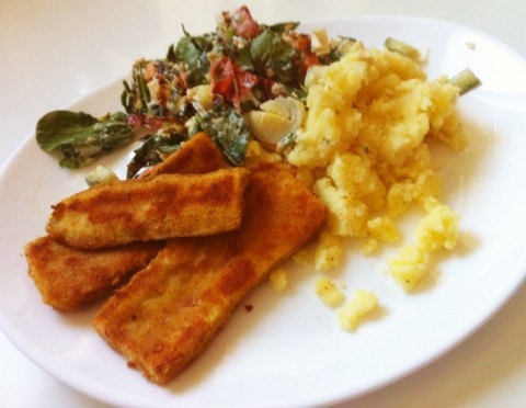 Idag lagade vi till en riktigt god och nyttig söndagslunch: panerade zucchini, mos med dragon samt en spenatbladsbaserad sallad med fetaost och cashewnötter. Det blev hur gott som helst.
