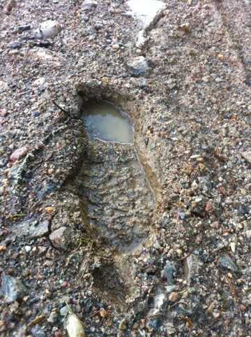 När mitt (valfri svordom) förnuft äntligen togs till fånga var det för sent att svänga på dem mjuka skogs”vägen”. Hade vi stannat hade vi suttit fast. Till slut kom vi till en y-korsning med ena vägen i uppförslut, dör vågade jag stanna och backa ner och vända på anslutningsvägen. Därefter parkerade vi på närmaste mötesficka och tig vår promenad.