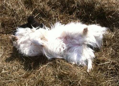 Ni kommer väl ihåg bilden på gyttjemonstret från 2011? Om någon tvekar över min lilla skunks intressen behöver ni inte tveka längre. Igår när var vi och fixade i fårhagen, gissa vem som låg och rullade sig i fårbajs och gammalt ensilage mest hela tiden?