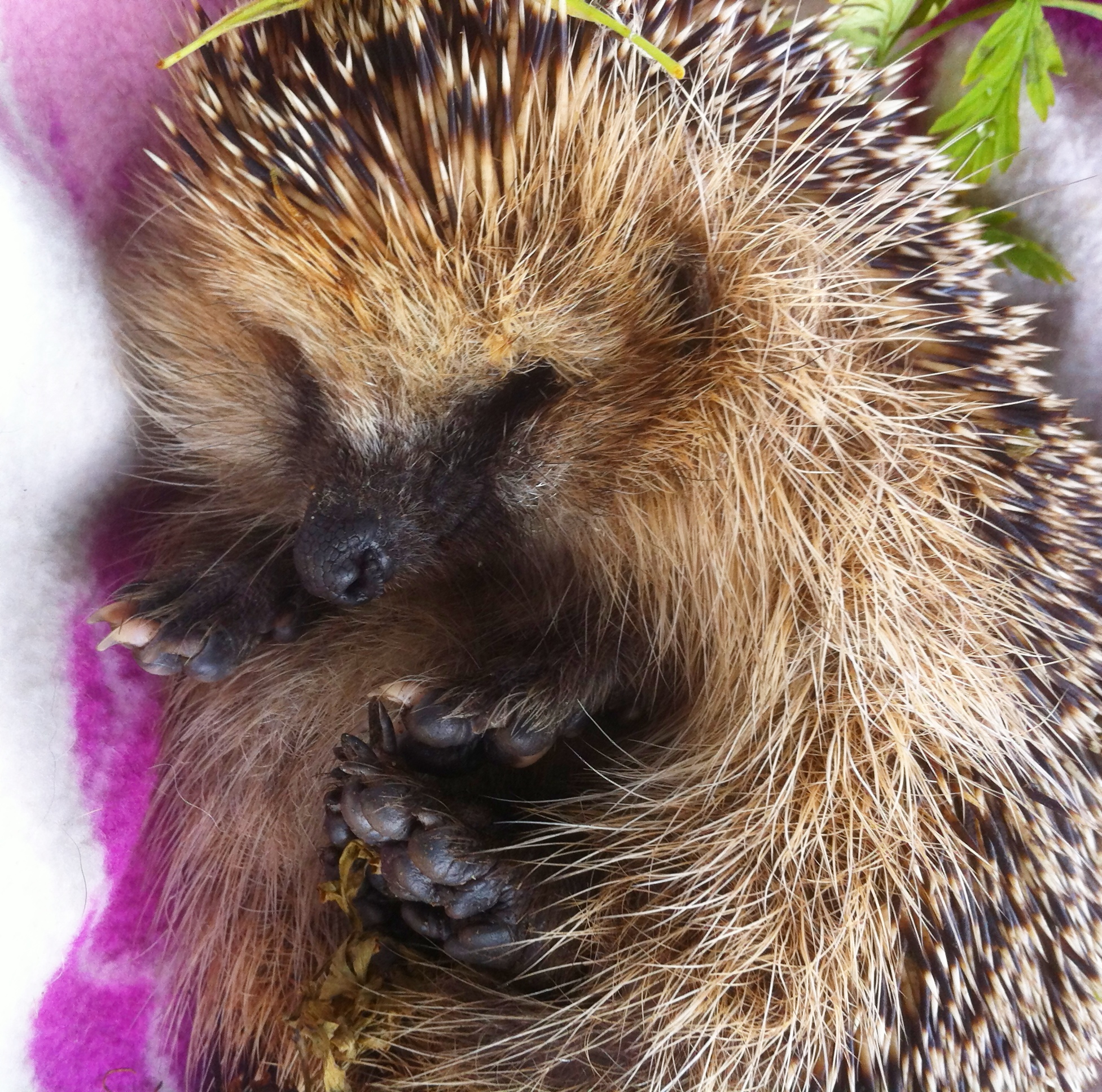 Medan vi satt och hängde i tältet kom en liten igelkott och spatserande förbi. Fört blev jag jätteglad och nyfiken, men snart såg jag att den skadat ena bakbenet. Aktion ”rädda igelkotten” satte igång. Började med att ringa min kollega som är en av kontaktpersonerna på Katastrofhjälp Fåglar och Vilt. Efter många om och men visade det sig att igelkottshonor som precis fått ungar kan släpa benen bakom sig. Vår uppgift blev då att könsbestämma den lilla krabaten. Vilket skulle visa sig vara lättare sagt än gjort, men med ett stort mått tålamod visade hon tillslut upp sin mage och vi kunde se att det var en hona.