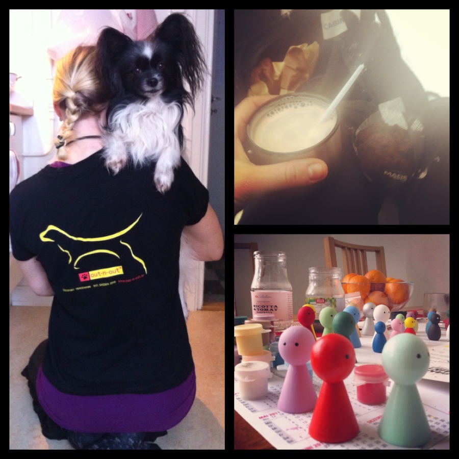 På väg hem fick jag mess från Sara, vilket ledde till lunch och ytterligare en fika hemma hos henne. På bordet stod en armé av ursöta smågubbar hon målat inför konflikthantering – Sara är ju min mentor när det gäller kommunikation, hon är grym! Gubbarna påminde om sötaste låten från 2012. 🙂