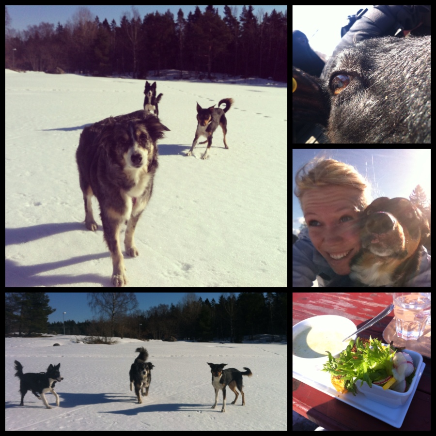 Senare kom Anna & Milla på besök för att hälsa på fåren. Först promenad i skogarna runt Långängen med efterföljande spenatsoppelunch i solen. Sjukt gott och mysigt. Vidare till fåren. Mycket is i hagen innebar att det inte blev någon vallning, men vi kunde i alla fall mysa i solen en stund till. Och Ozz, ja, hon älskar att titta på fåren – hon var mycket nöjd med utflykten.