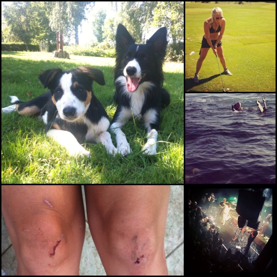 Semestern började först i lördags, eftersom innan dess var jag ju sjuk – sjuk = inte semester. Följde med M till Varberg och körde kureringshelg. Ja, jo… om vi räknar det som kureringshelg när det blev både korthålsgolf (mentalträning på hög nivå), havs-simningsdebut (med våtdräkt och allt – shit vad saltvatten smakar illa!) OCH vattenskidsdebut (epic fail – bilden säger allt). Snöt havsvatten ur näsan hela måndagen! Bra där, lär ju rensar mitt system rejält. Utvilad med träningsvärk blev helgens resultat, skönt!
