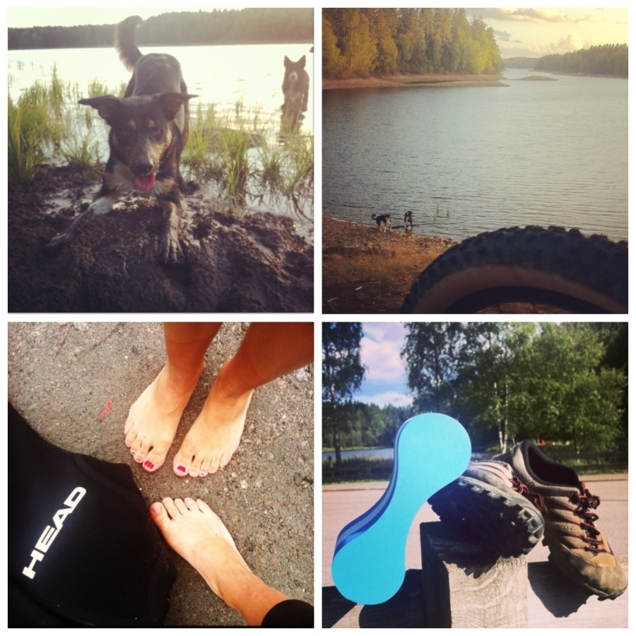 Sedan har det blivit swimrun-träning med Olles Bootcamp-gänget (Gabbe, Olle, Jani, Kiwi och Peter). Började med blodiga backintervaller och avslutade med att springa varvat med att simma i en åtta runt Kyppesjön – vi snackar kasta sig i vattnet med skorna på och köra järnet. Riktigt rolig träning. Annorlunda. Efteråt tog rovdjuren och jag en MTB tur med bad (både i gyttja och i Storsjön) och de fick verkligen sträcka ut. Härligt!