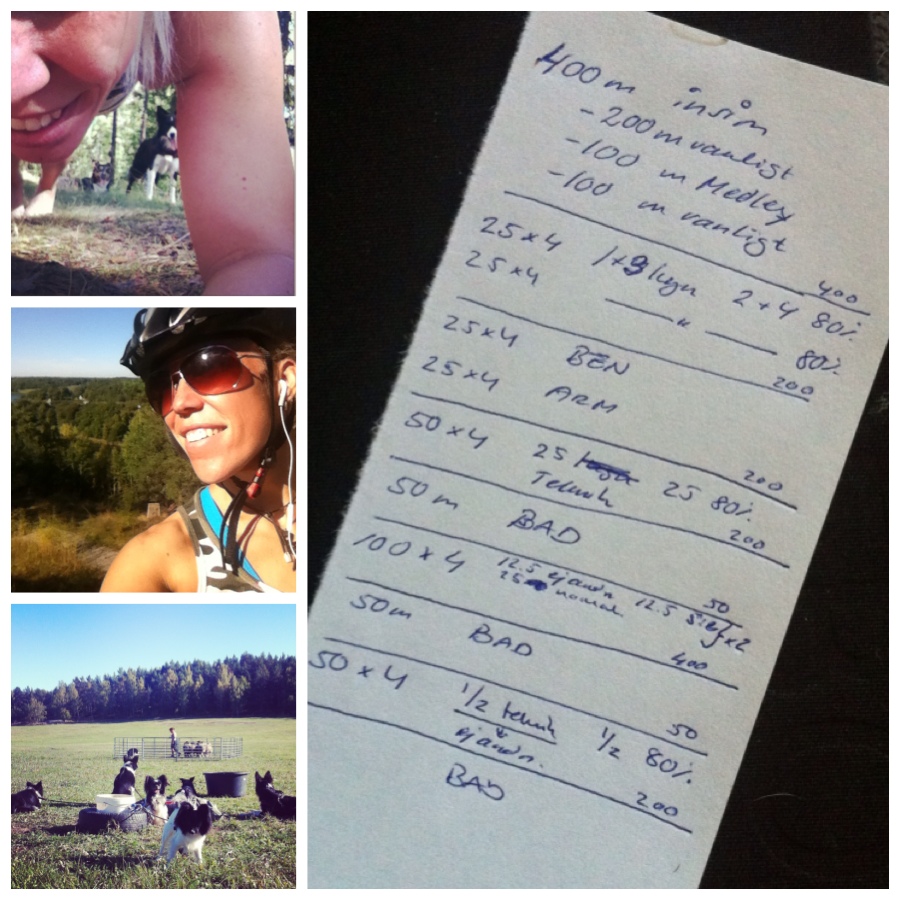 Själv har jag komponerat ihop mitt första egna simpass som jag skall testa att köra igenom på kvällens LT-träning. Tagit en hel del tips från ”du-har-inte-heller-något-liv”-träningen från i fredagskväll (tänk om folk visste hur agilityfolks liv ser ut…): teknik blandat med fart. La till en egen del med fart från att ha tagit det lugnt halva längden. Vet inte, men det känns vettigt att träna fart från rörelse, påskjut utan kant… Vi får väl se. Sedan Bastu med Tilde, som senare i höst drar till Sydamerika… vem skall jag då simma emot?!
