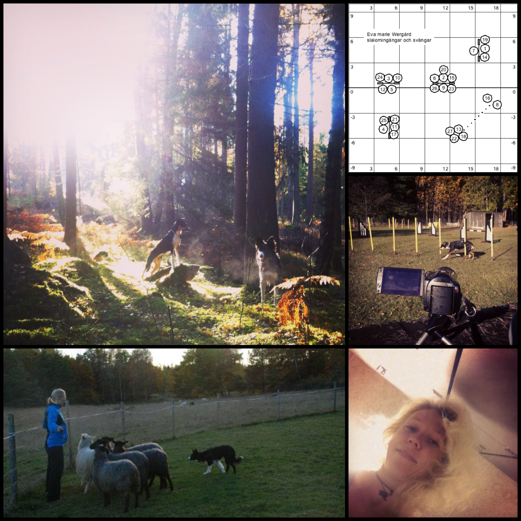 Därför blev det agility och skogspromenad innan jobb. Helt fantastiskt ljus i skogen idag, trollskt. Även agilityträningen gick bra och jag filmade en del. Fått låna en videokamera av Mikael. Tyvärr vet jag inte hur jag får ut filmerna… än. Men, det kommer. Banskiss på hoppbanan som jag körde med Ozz finner ni ovan – många nummer. Går att köra i olika omgångar – en måste inte köra hela på en gång.