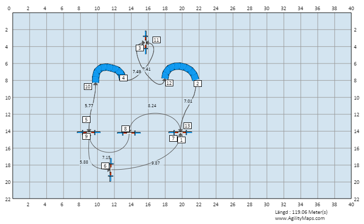 Har ju fått vatten i min dator, så efter att ha instruerat kändes det snopet att inte kunna dela med mig av banan vi tränade på… men så lades en länk till en BETA-version av ett banritningsprogram upp på Agility nyheter. Hurrey! Inte alls lika bra som course design, som jag skall fixa tillbaka med nya datorn, men helt OK tills vidare. Verkligen helt OK.