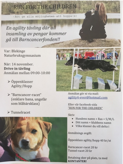 Nu har hon med ett gäng klasskompisar dragit igång ett fantastiskt initiativ! RUN for the children Agilitytävling, där de den 14 nov bjuder in till agilitytävling med insamling till Barncancerfonden. Jag blir så jäkla stolt över dem allihop! Ni gör mig så GLAD!!